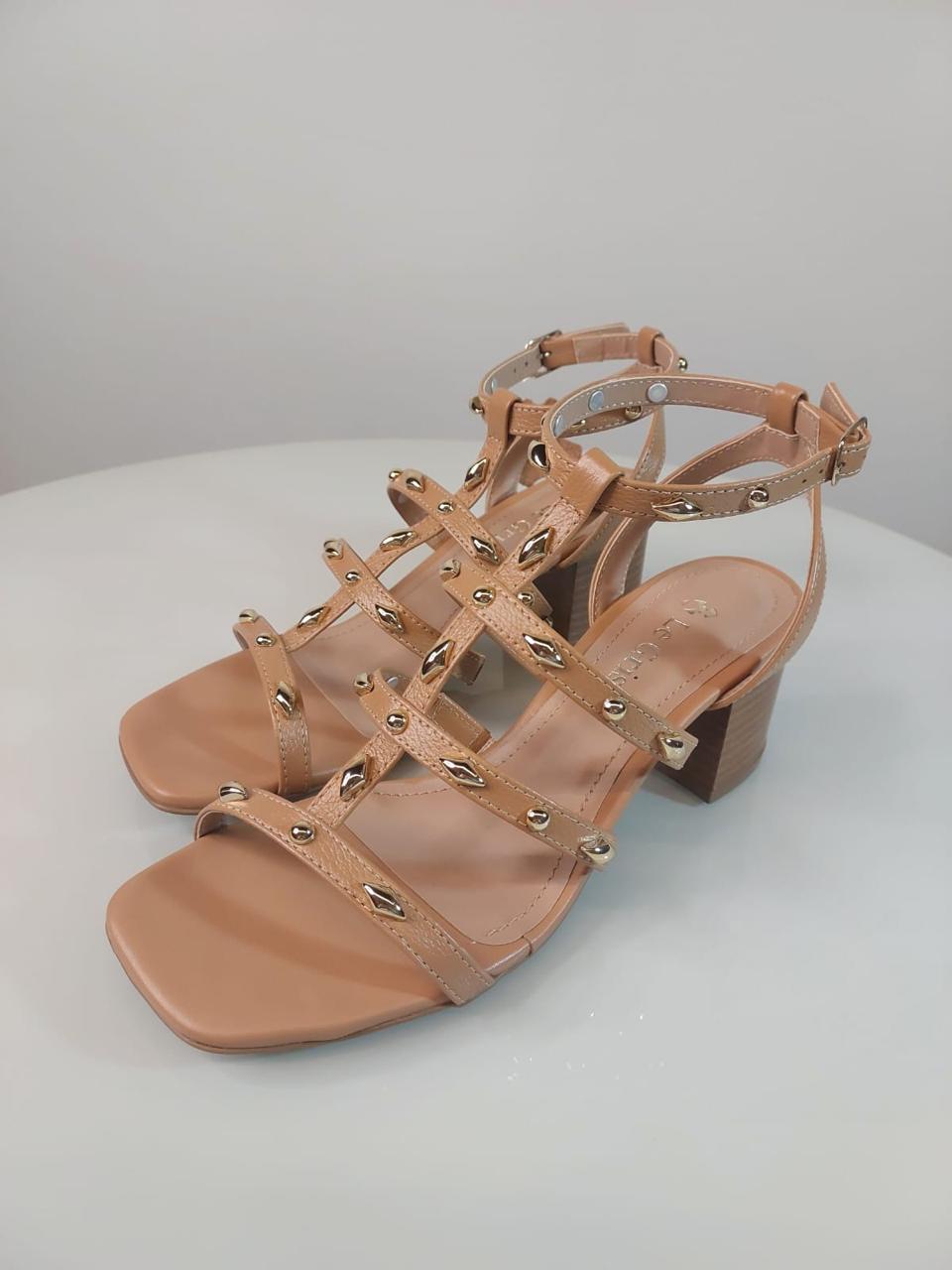 SANDÁLIA SALTO BLOCO CARAMELO COM TAXAS DOURADAS Sofisticação em cada detalhe elevando qualquer produção com charme e elegância.