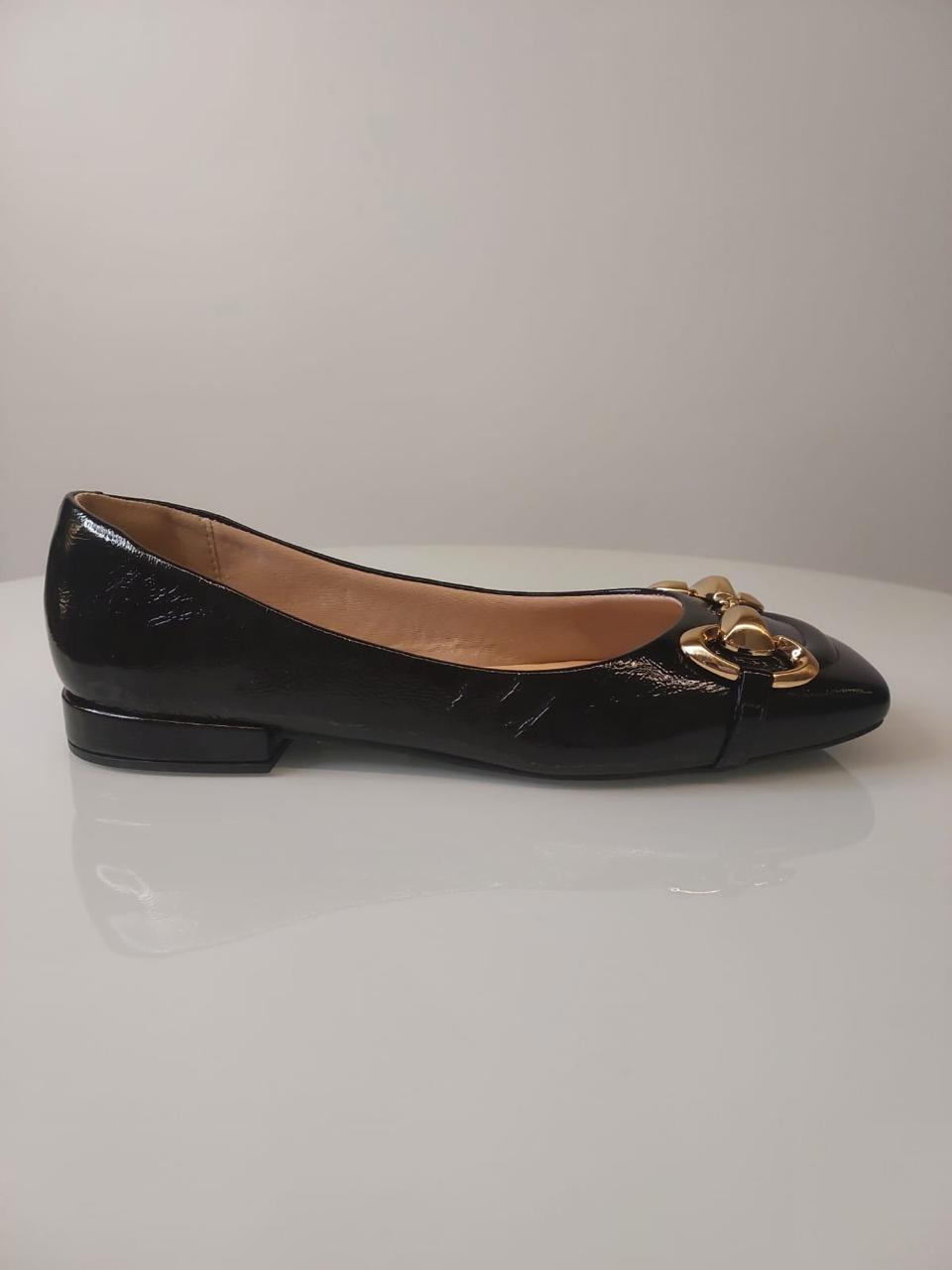 SAPATILHA PRETA VERNIZ FIVELA DOURADA Sofisticação em cada detalhe elevando qualquer produção com charme e elegância.